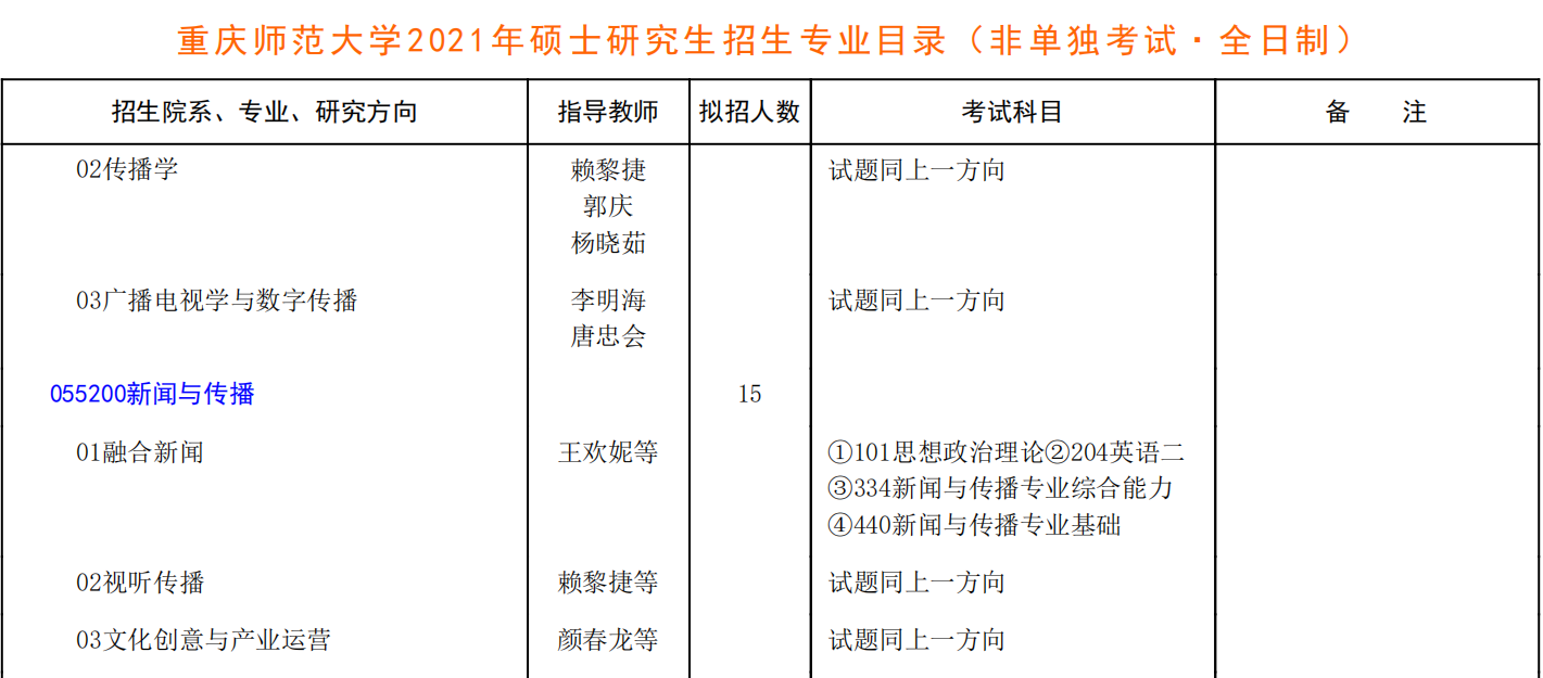 以上是“2021新傳專業目錄:重慶師范大學2021 年招收新傳碩士學位專業目錄”的全部內容,有需要趕緊記下來!考研必勝!