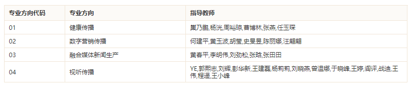 新聞與傳播碩士專業學位(Master of Journalism and Communication,MJC)培養以專業實踐為導向,重視新聞傳播專業實踐和應用。分為四個培養方向: