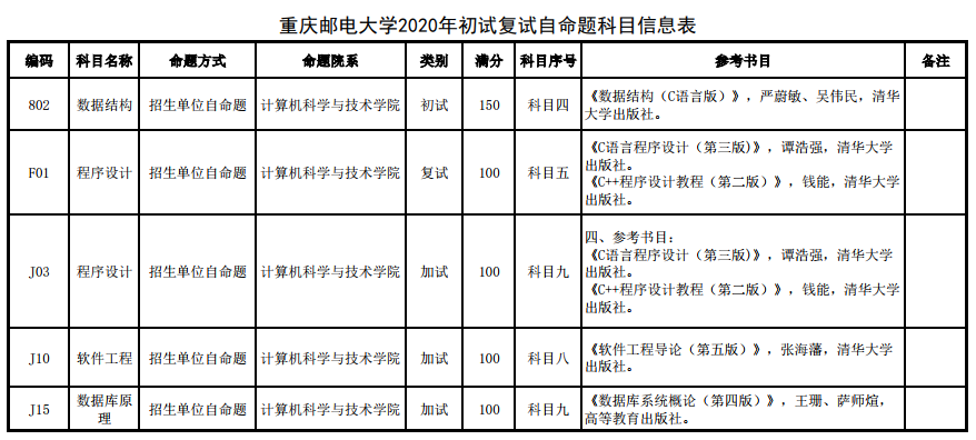 重慶郵電大學2020年軟件工程學院碩士研究生(學術型)考試科目及參考書