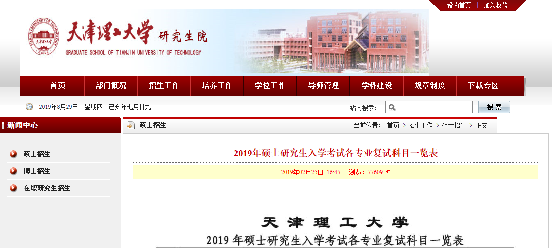 2019年天津理工大學(xué)碩士研究生入學(xué)考試各專業(yè)復(fù)試科目一覽表