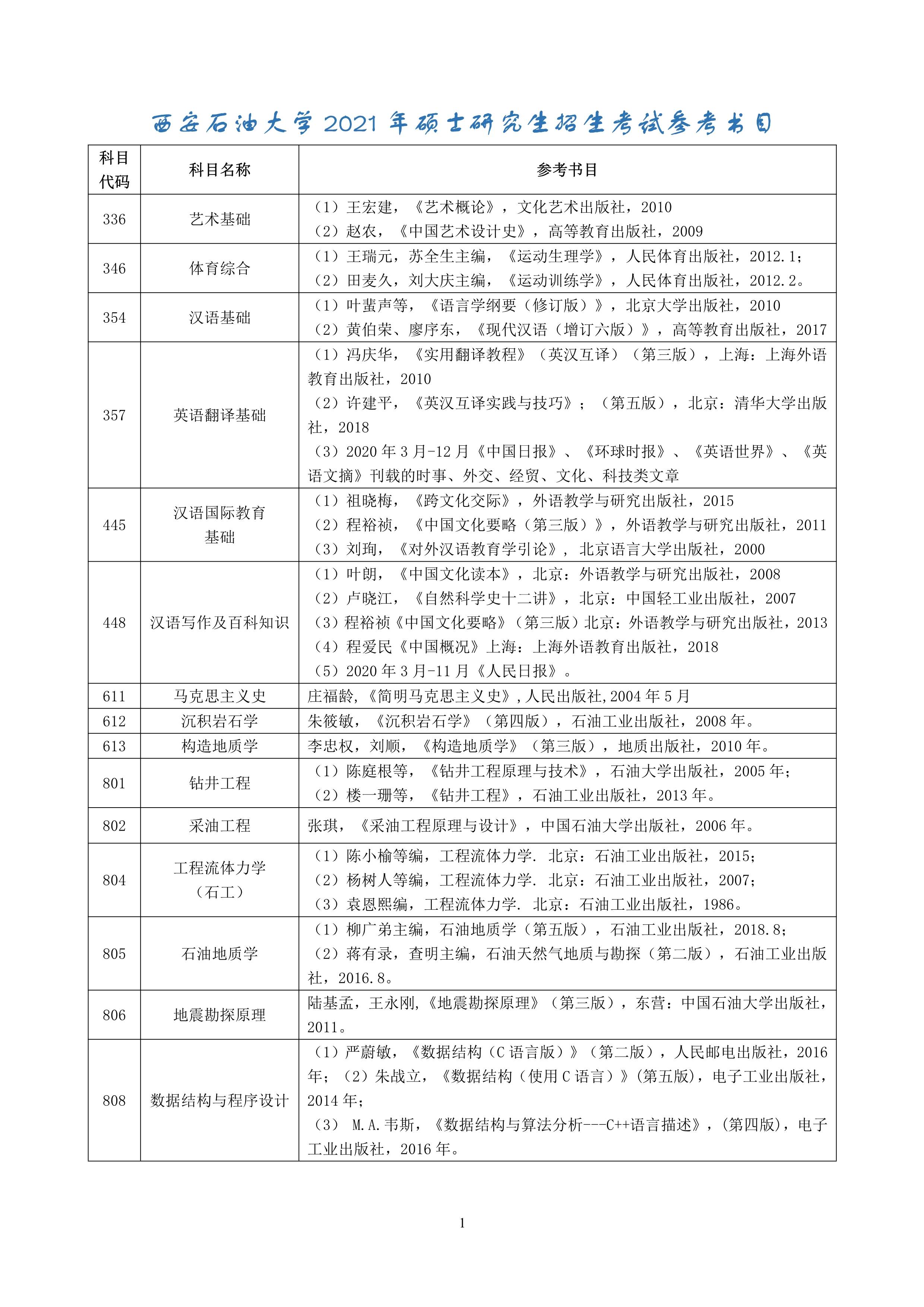 以上就是“2021考研參考書目:西安石油大學(xué)2021年碩士研究生入學(xué)考試參考書目”的全部內(nèi)容!更多2021考研院校參考書目等干貨,盡在研線網(wǎng)!