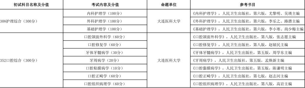 大連醫科大學2022年碩士研究生招生考試初試科目及參考書目
