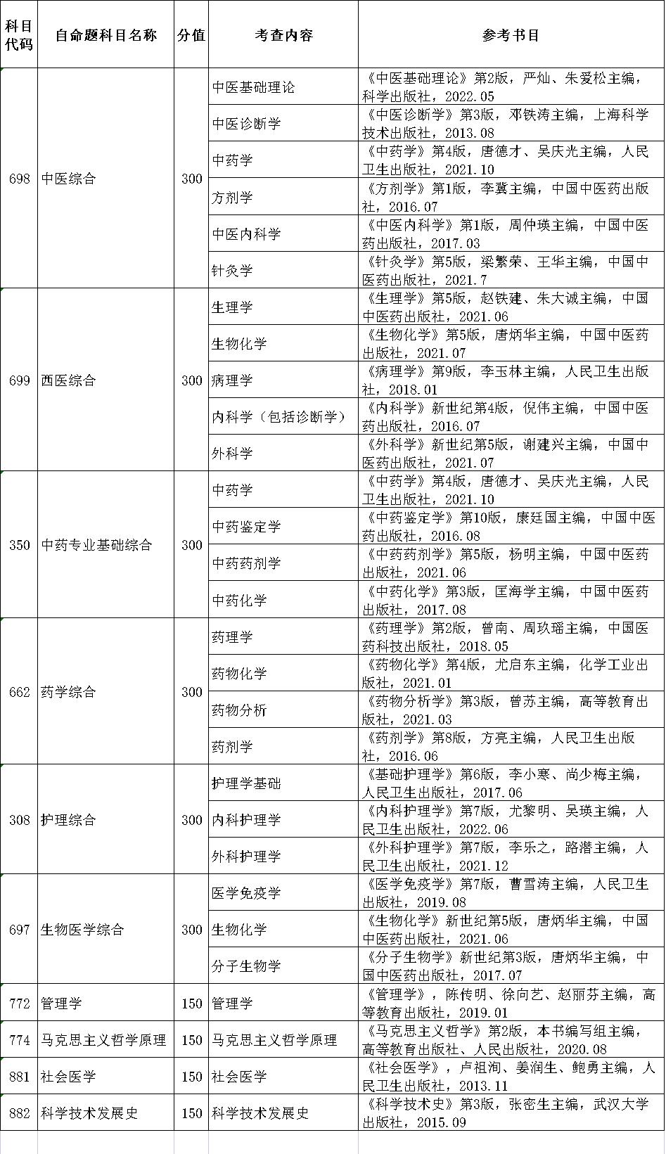 廣州中醫(yī)藥大學(xué)2023年碩士研究生全國統(tǒng)考自命題考試科目參考書目