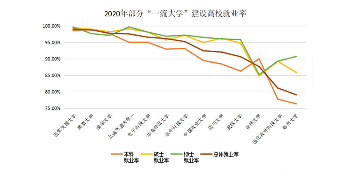 此外,南京大學、清華大學、上海交通大學、電子科技大學、華東師范大學、華中科技大學等6所高校2020屆畢業生的總體就業率也在95%以上。