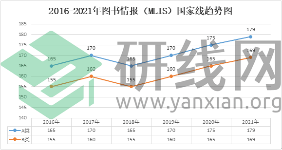 從近六年國家線走向我們可以看出,A區和B區圖書情報分數線一直呈現上漲的趨勢,國家線A類最高分為在2021年的179分,單科達到92分,2021年的國家線B類最高分也達到了169分,單科達到82分。國家線既是作為復試分數線參考,也是調劑分數線參考,同學們不要陷入通過國家線就能夠考上研究生的誤區,最終看個人是否能進入復試,還是要看院校給出的分數線,也就是我們所說的“校線”、“院線”。總而言之,分數越高越好。