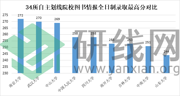 從上面柱狀圖中可以看出,圖書情報碩士34所自主劃線院校的全日制錄取最高分整體均在240分以上,全日制錄取最高分最低的是山東大學244分,全日制錄取最高分最高的院校是南京大學272分。其中分數在240-250分(包括250分)的院校有1所,分數在251-260分(包括260分)的院校有5所,分數在261-270分(包括270分)的院校有2所,分數在270分以上的院校有1所。想報考34所自主劃線院校的同學可以根據自身情況選擇更適合自己的院校!