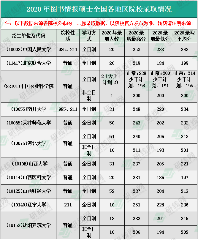 二、2020年全國圖書情報碩士院校錄取情況分析