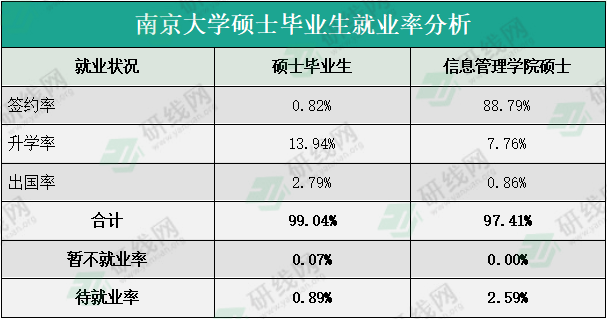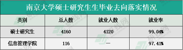 南京大學2020屆畢業生共8161人,其中碩士畢業生4160人,占畢業生總人數的50.97%;2020屆畢業生中,男生數為4002人(占49.04%),女生數為4159人(占50.96%),男女性別比為0.96;2020屆碩士畢業生總體就業率為99.04%,信息管理學院碩士就業率為97.41%。