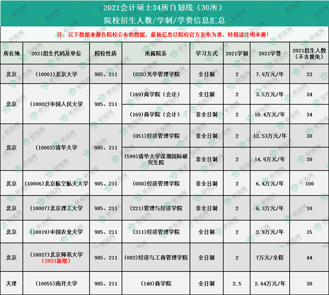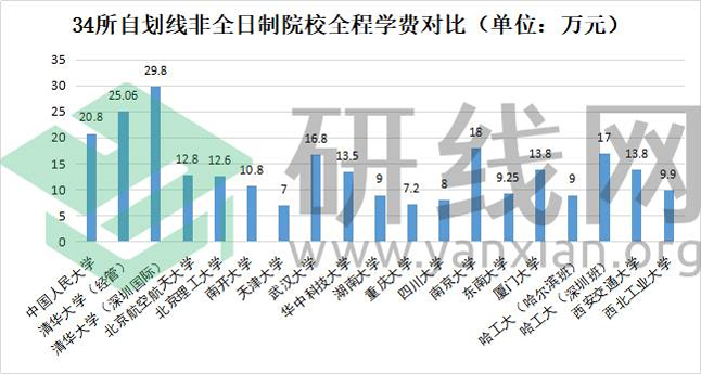如上圖所示,34所自劃線非全日制院校全程學(xué)費(fèi)TOP3分別為:清華大學(xué)(深圳國際研究院)29.8萬、清華大學(xué)(經(jīng)濟(jì)管理學(xué)院)25.06萬、中國人民大學(xué)20.8萬,全程學(xué)費(fèi)均在20萬元以上,除此之外,非全日制全程學(xué)費(fèi)在9萬元/年以上的院校還有:北京航空航天大學(xué),北京理工大學(xué),南開大學(xué),武漢大學(xué),華中科技大學(xué),湖南大學(xué),南京大學(xué),東南大學(xué),廈門大學(xué),哈爾濱工業(yè)大學(xué)(哈爾濱班和深圳班),西安交通大學(xué),西北工業(yè)大學(xué),另外,中山大學(xué)學(xué)制3年,2020年學(xué)費(fèi)7.95萬元/年,復(fù)旦大學(xué)學(xué)制2-3年,2020年學(xué)費(fèi)11.52萬元/年,同濟(jì)大學(xué)學(xué)制3年,2020年學(xué)費(fèi)9.12萬元/年,可作為參考,東北大學(xué)學(xué)制3年,學(xué)費(fèi)官方暫未公布,整體而言,34所自劃線會計(jì)碩士非全日制的學(xué)費(fèi)相較于全日制更高,非全日制學(xué)費(fèi)普遍高于9萬元/全程。