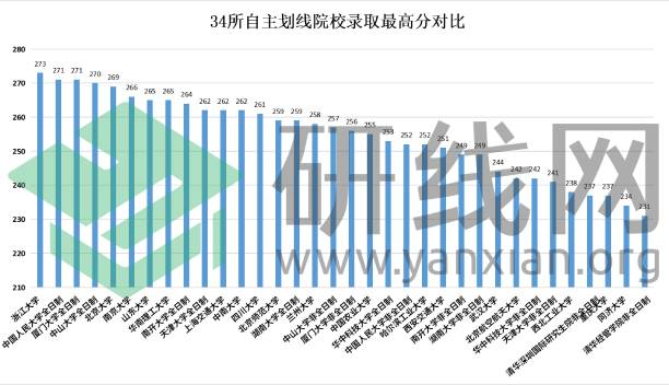 從上面柱狀圖中可以看出,會計碩士34所自主劃線院校的錄取最高分整體均在230分以上,錄取最高分最低的是清華大學經濟管理學院非全日制231分,錄取最高分最高的院校是浙江大學273分。