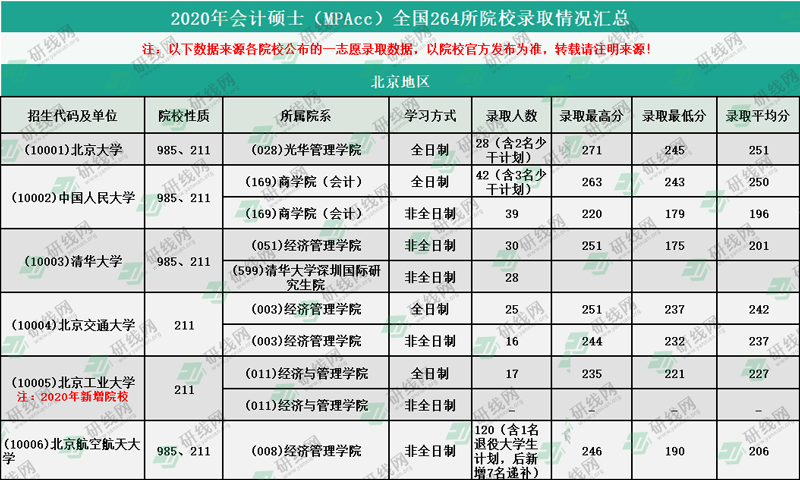 其中分數在160-180分(包括180分)的院校有35所,分數在181-200分(包括200分)的院校有62所,分數在201-220分(包括220分)的院校有111所,分數在221-240分(包括240分)的院校有60所,分數在240分以上的院校有10所。以上會計碩士2020年各院校錄取數據僅供參考!