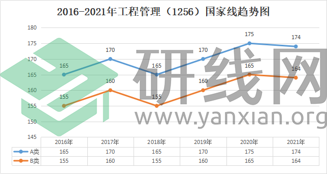 從近六年國家線走向我們可以看出,A區和B區工程管理分數線一直呈現上漲的趨勢,國家線最高分為在2020年的175分,單科達到88分,2021年的國家線也達到了174分,單科達到86分。國家線既是作為復試分數線參考,也是調劑分數線參考,同學們不要陷入通過國家線就能夠考上研究生的誤區,最終看個人是否能進入復試,還是要看院校給出的分數線,也就是我們所說的“校線”、“院線”。總而言之,分數越高越好。