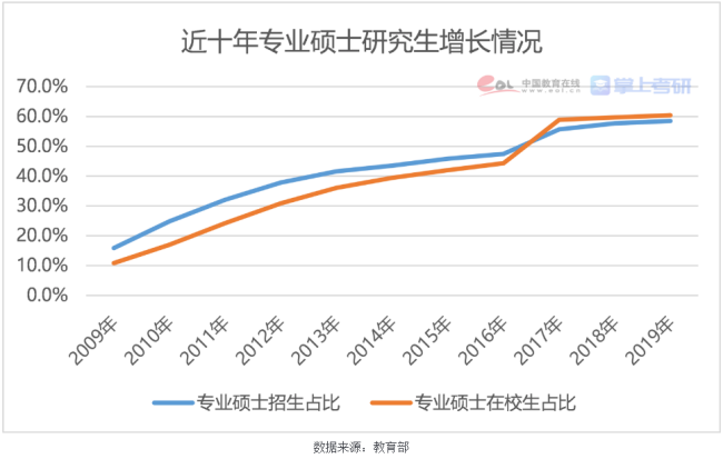 教育部與國務院學位委員會發布的《學位與研究生教育發展“十三五”規劃》指出,到2020年,我國“專業學位碩士招生占比達到60%左右”。