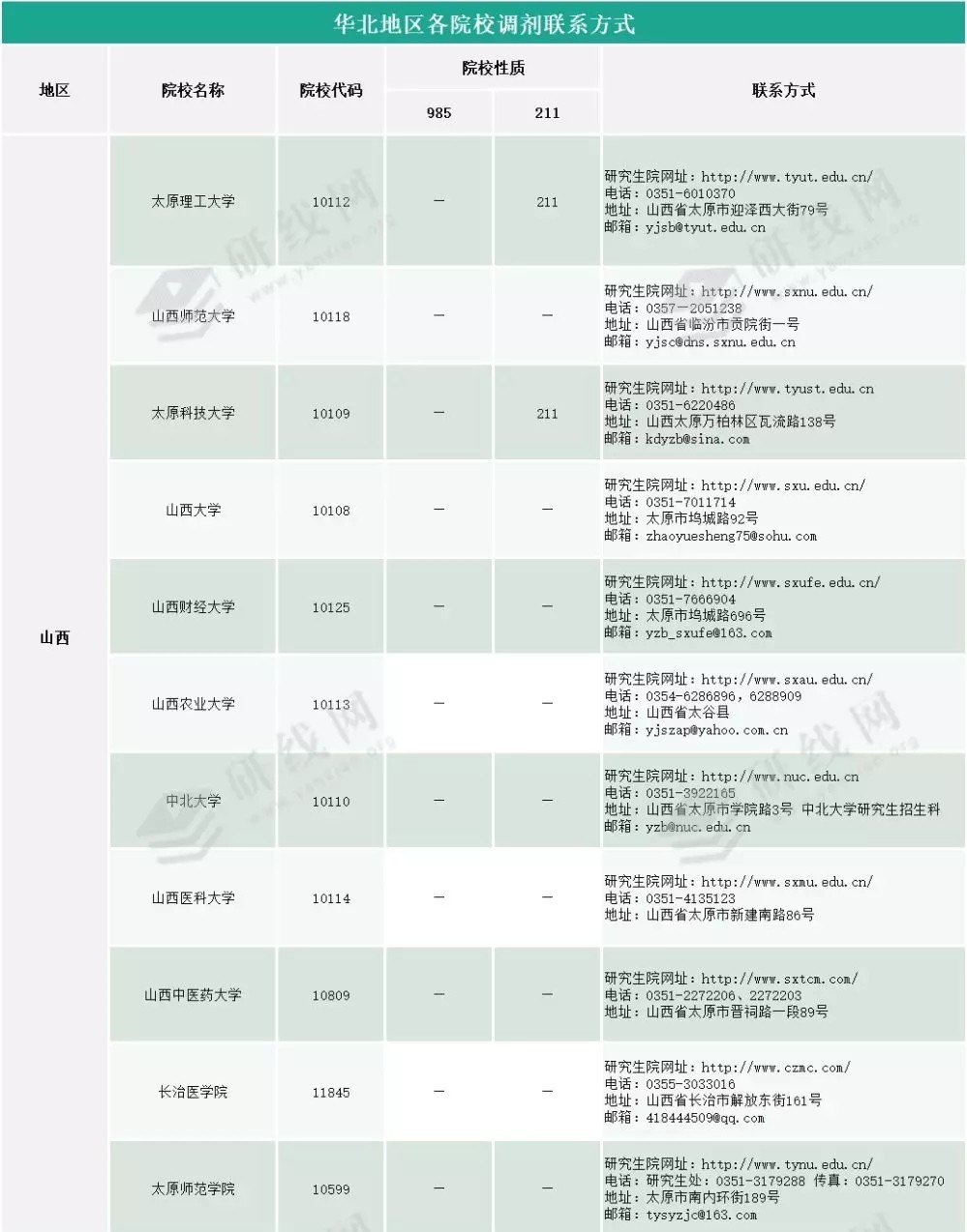 以上就是“2020年華北地區(qū)院校調(diào)劑聯(lián)系方式查詢”的全部內(nèi)容,更多調(diào)劑相關內(nèi)容,請關注“調(diào)劑信息”欄目。祝您考研成功!
