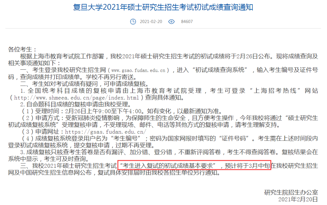 我校2021年碩士研究生招生考試“考生進入復試的初試成績基本要求”,預計將于3月中旬在我校研究生招生網及中國研究生招生信息網公布。