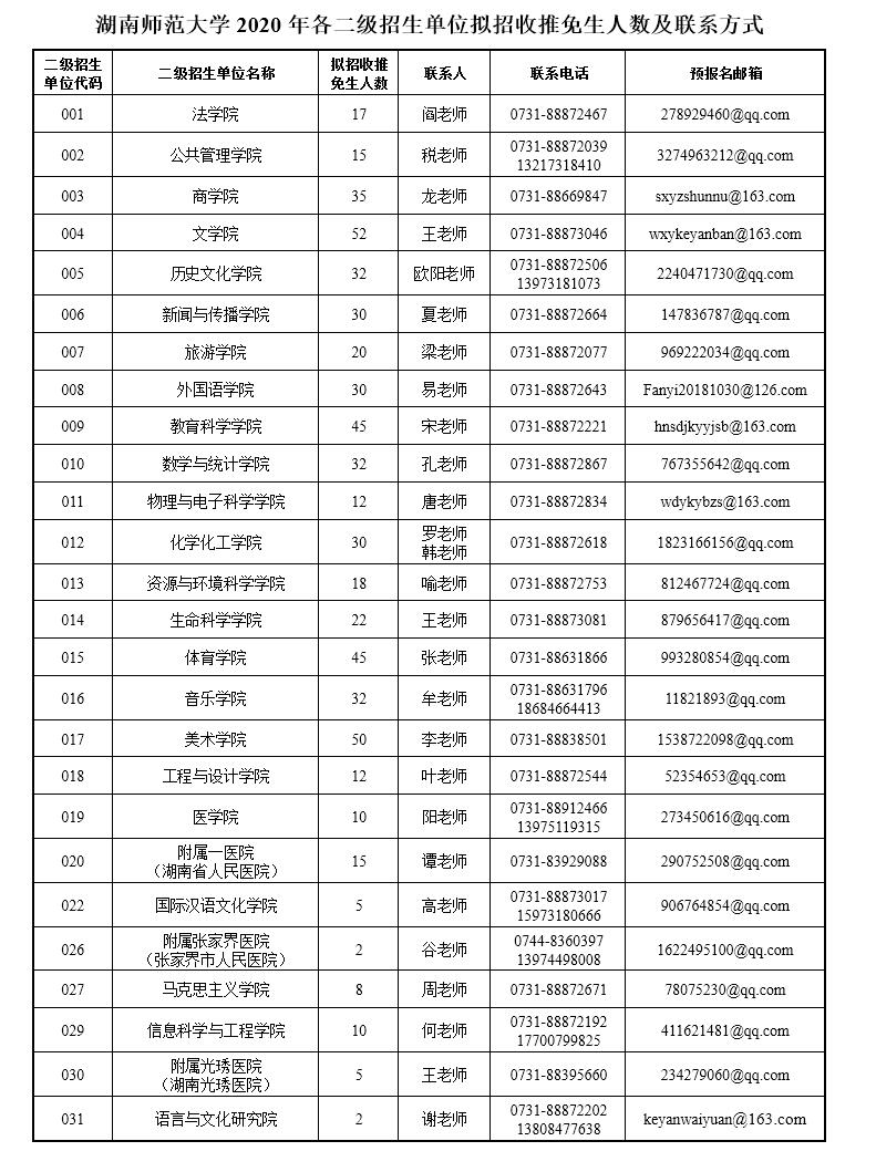附件1:湖南師范大學(xué)2020年各二級(jí)招生單位擬招收推免生人數(shù)及聯(lián)系方式