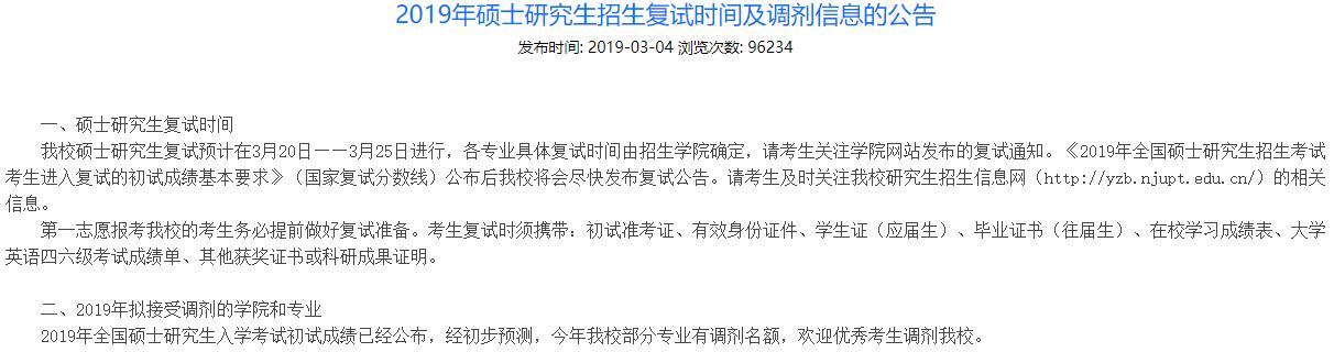 我校碩士研究生復試預計在3月20日——3月25日進行,各專業具體復試時間由招生學院確定,請考生關注學院網站發布的復試通知。《2019年全國碩士研究生招生考試考生進入復試的初試成績基本要求》(國家復試分數線)公布后我校將會盡快發布復試公告。請考生及時關注我校研究生招生信息網(http://yzb.njupt.edu.cn/)的相關信息。