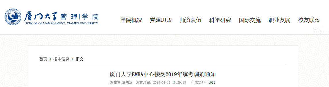 即日起至3月20日,廈門大學(xué)EMBA中心接受2019年全國MBA / EMBA考生調(diào)劑至我校EMBA項(xiàng)目的申請。