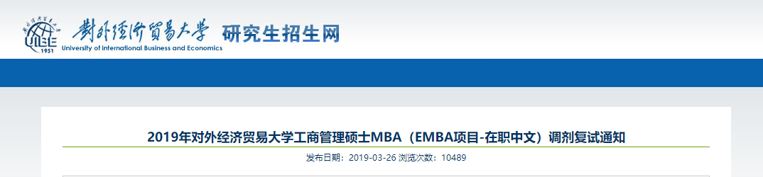 根據(jù)《對(duì)外經(jīng)濟(jì)貿(mào)易大學(xué)復(fù)試工作管理辦法》中關(guān)于調(diào)劑生源復(fù)試工作的相關(guān)規(guī)定,國(guó)際商學(xué)院對(duì)2019年攻讀工商管理碩士EMBA項(xiàng)目(在職中文)研究生調(diào)劑的復(fù)試相關(guān)事宜通知如下: