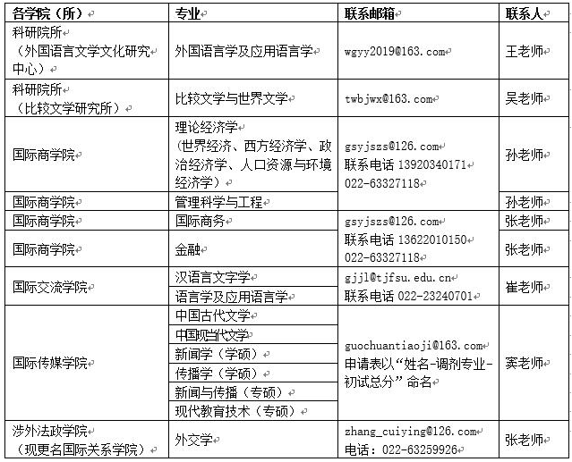 預調劑申請以下專業的考生可下載附件《天津外國語大學2019年碩士研究生復試預調劑申請表》,通過電子郵件(請以“姓名_調劑專業”命名)并將調劑申請表發送至各學院(所)聯系郵箱。目前調劑僅為預調劑環節,屬于咨詢性質,并不等于調劑成功,最終調劑名單必須在中國研究生招生信息網調劑系統,根據教育部調劑相關政策,經過導師組篩選后,在系統中發送復試通知的考生為準。
