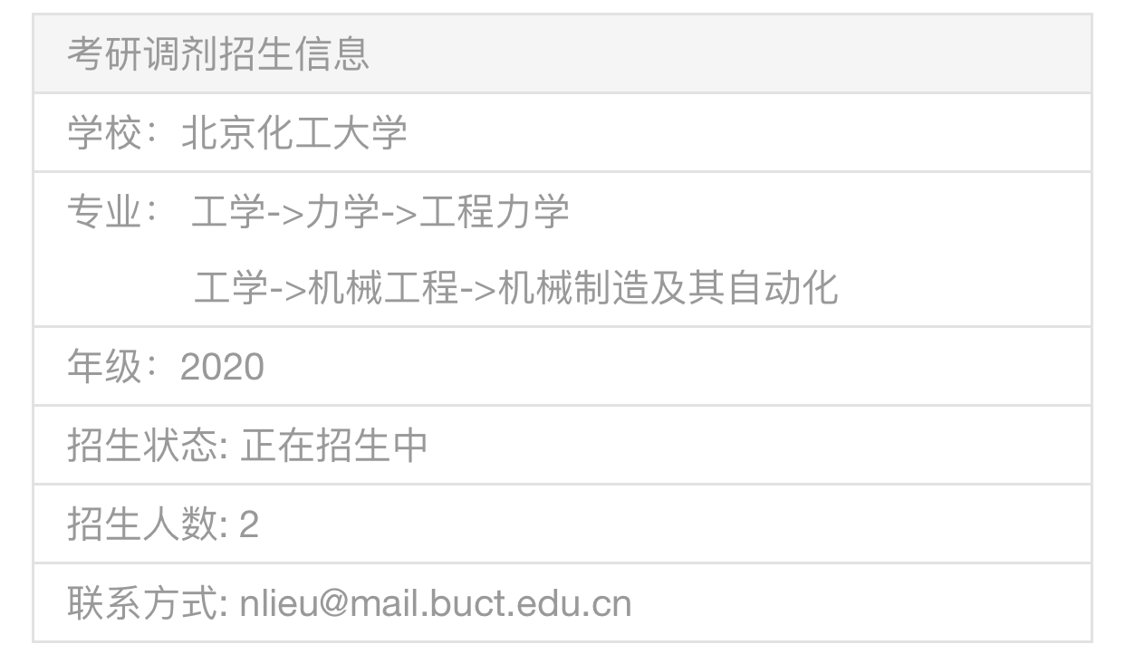 以上就是“2020考研調(diào)劑信息:北京化工大學(xué)機電工程學(xué)院誠招2020級力學(xué)相關(guān)專業(yè)碩士研究生”,的全部內(nèi)容,2020考研全國調(diào)劑綜合服務(wù)平臺正式上線!三大功能亮點,幫你輕松調(diào)劑!