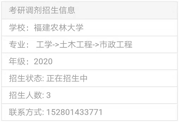 以上就是“2020考研調劑信息:福建農林大學土木工程接收碩士調劑生”,的全部內容,2020考研全國調劑綜合服務平臺正式上線!三大功能亮點,幫你輕松調劑!
