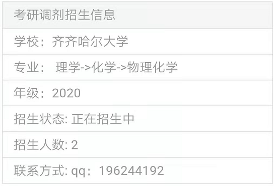 以上就是“2020考研調劑信息:齊齊哈爾大學物理化學專業接收碩士調劑生”,的全部內容,2020考研全國調劑綜合服務平臺正式上線!三大功能亮點,幫你輕松調劑!