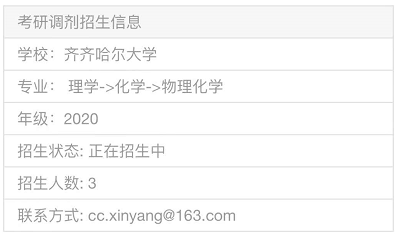 以上就是“2020考研調(diào)劑信息:齊齊哈爾大學(xué)物理化學(xué)專業(yè)接收碩士調(diào)劑生”,的全部內(nèi)容,2020考研全國調(diào)劑綜合服務(wù)平臺正式上線!三大功能亮點(diǎn),幫你輕松調(diào)劑!