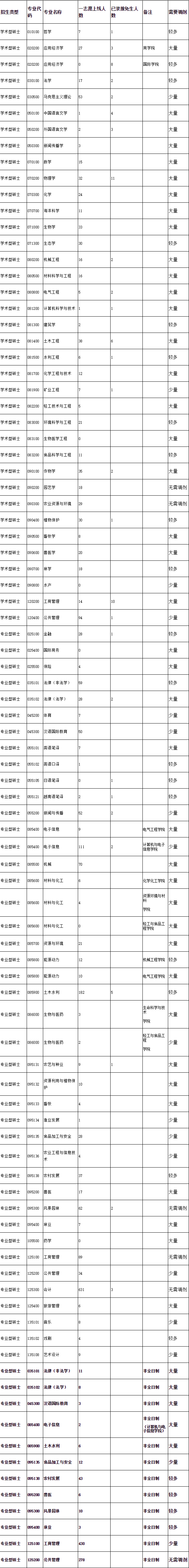 備注:“需要調(diào)劑”欄內(nèi),“少量”指預(yù)計名額≦10;“較多”指10<預(yù)計名額<25;“大量”指預(yù)計名額≧25。