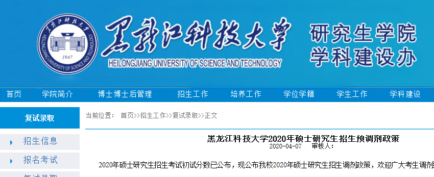 有關2020年碩士研究生招生調劑及復試錄取政策詳細內容請及時關注我校近期在研招網和黑龍江科技大學研究生學院網站發布的相關信息。