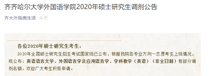 以上就是“2020考研調(diào)劑信息:齊齊哈爾大學(xué)外國語學(xué)院2020年碩士研究生招生調(diào)劑信息”的全部內(nèi)容!更多考研調(diào)劑內(nèi)容,請關(guān)注考研調(diào)劑信息欄目!