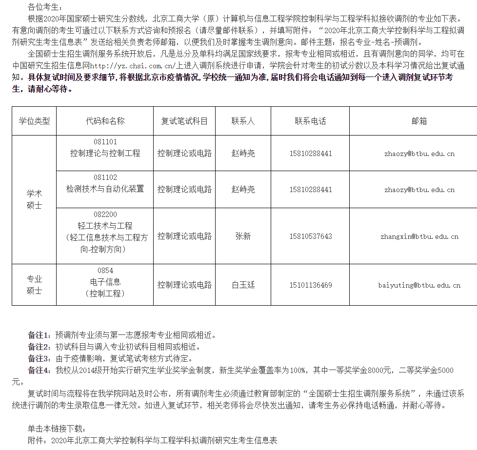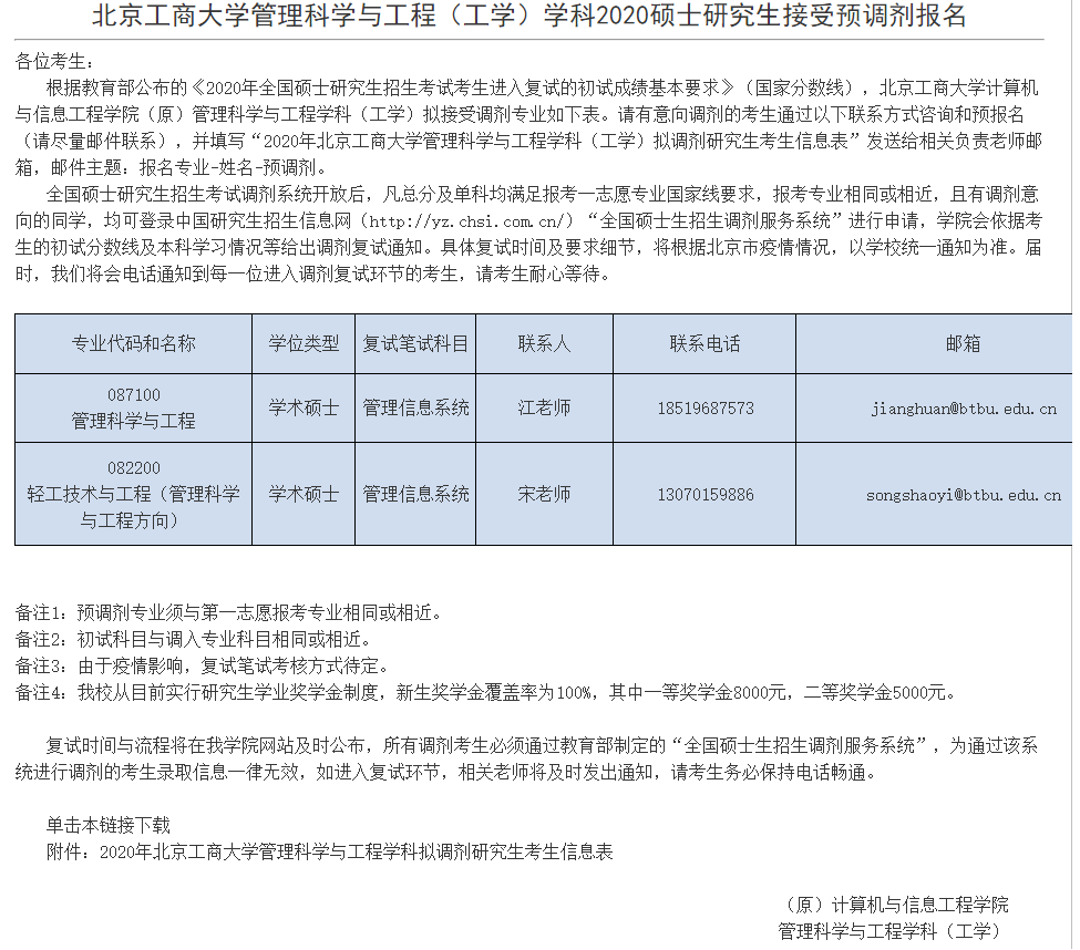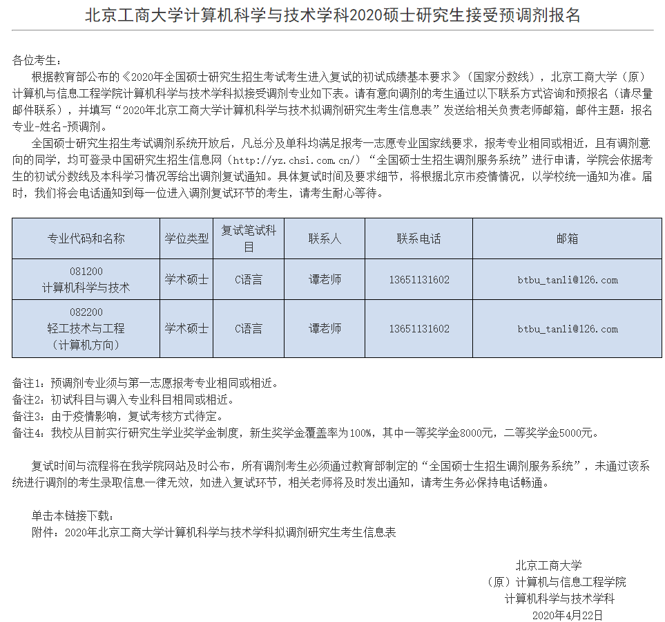 以上就是“2020考研調(diào)劑信息:北京工商大學(xué)計算機與信息工程學(xué)院2020年碩士研究生招生調(diào)劑信息”的全部內(nèi)容!更多考研調(diào)劑內(nèi)容,請關(guān)注考研調(diào)劑信息欄目
