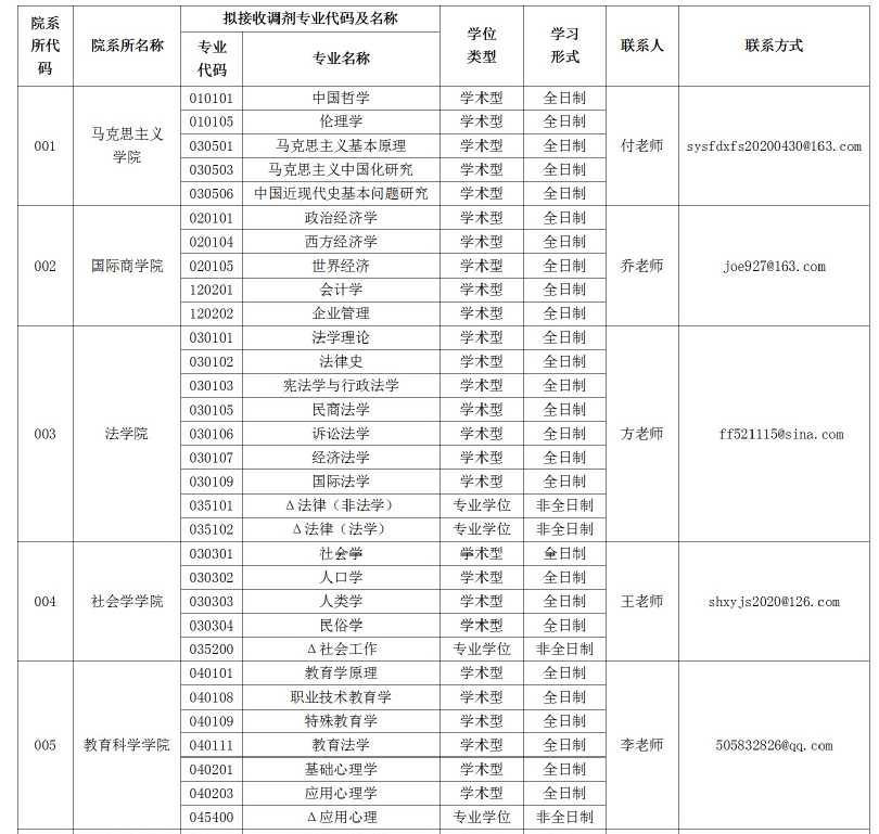 2020年我校擬接收調(diào)劑專業(yè)及調(diào)劑咨詢方式詳見下表(表中專業(yè)名稱前帶“Δ”為專業(yè)學(xué)位):