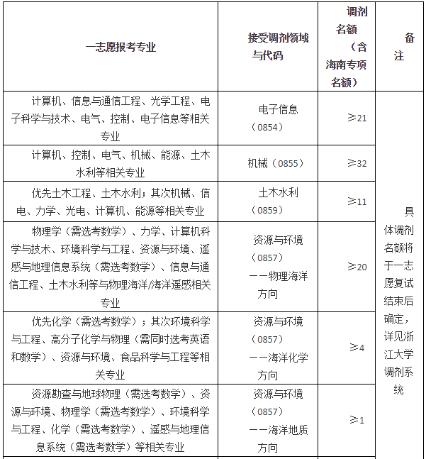 海洋學院及海南浙江大學研究院專項http://oc.zju.edu.cn/2020/0430/c30428a2092233/page.htm,目前有部分專業學位碩士名額接受調劑。調劑考生的初試成績須達到一志愿報考學科門類的學校基本線要求。