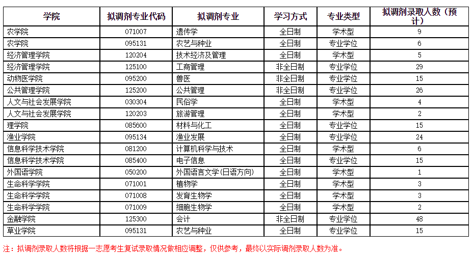 3、調劑工作將于5月20日后開展,我校將在南農研招網和中國研招網調劑系統發布各調劑專業的具體要求,不接受“少數民族骨干計劃”、“退役大學生士兵計劃”、單獨考試考生的調劑,調劑考生屆時請關注網站通知。
