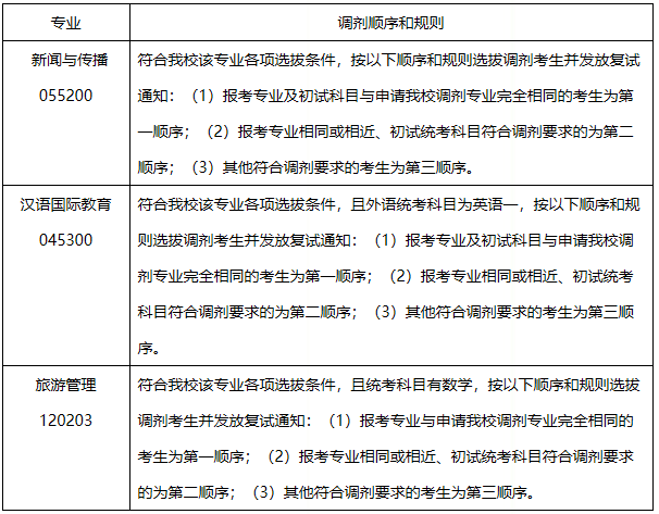 第五條 擬對外調劑的專業:新聞與傳播(專業代碼:055200)、漢語國際教育(專業代碼:045300)、旅游管理(專業代碼:120203),各專業調劑名額為新聞與傳播擬調劑9人、漢語國際教育擬調劑11人、旅游管理擬調劑4人。