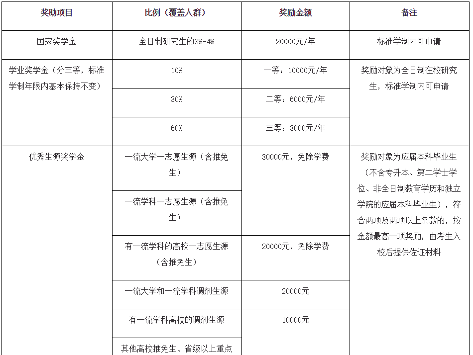 為完善研究生教育保障和激勵(lì)機(jī)制,吸引優(yōu)質(zhì)生源,調(diào)動(dòng)研究生參與科學(xué)研究和創(chuàng)新實(shí)踐積極性,學(xué)校設(shè)立多種獎(jiǎng)助學(xué)金。以2020級(jí)全日制非定向碩士研究生為例,每名同學(xué)獲得的獎(jiǎng)助學(xué)金不少于6000元/年,表現(xiàn)優(yōu)異的可達(dá)10萬(wàn)元以上,佛山校區(qū)全學(xué)段研究生享受新生獎(jiǎng)學(xué)金。獎(jiǎng)助體系具體情況見下表。