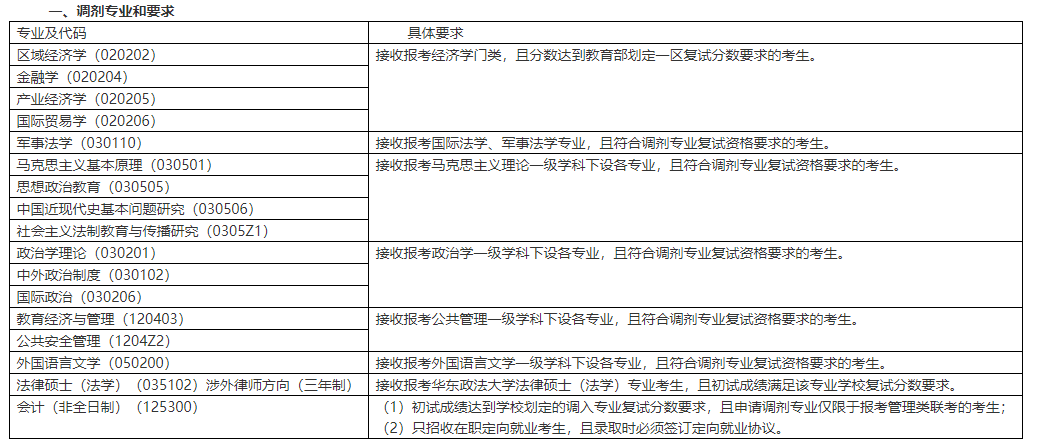 根據(jù)《教育部關(guān)于印發(fā)〈2021年全國碩士研究生招生工作管理規(guī)定〉的通知》(教學(xué)函[2020]8號)和教育部《關(guān)于做好2021年全國碩士研究生招生錄取工作的通知》》(教學(xué)司[2021]2號)文件精神,結(jié)合我校2021年碩士研究生招生工作的實際情況,現(xiàn)發(fā)布華東政法大學(xué)碩士研究生相關(guān)專業(yè)(方向)調(diào)劑通知。