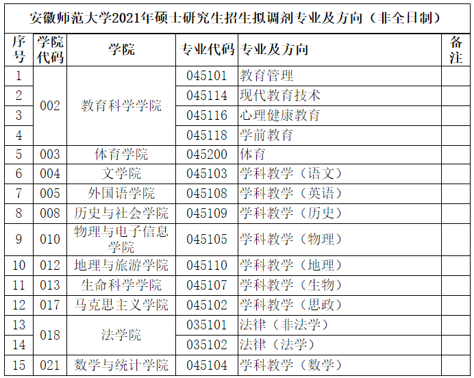 安徽師范大學2021年碩士研究生招生擬調劑專業及方向(全日制)