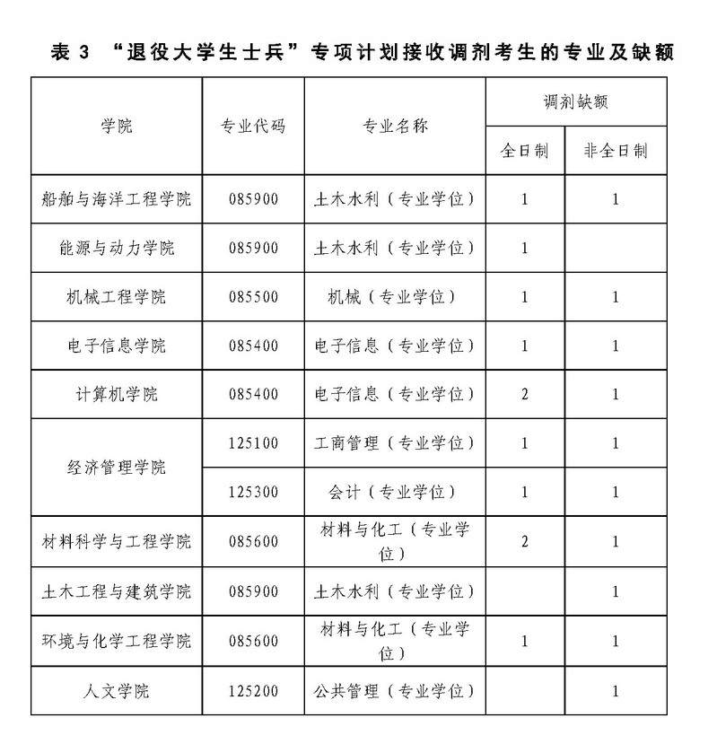 答:我校2021年“退役大學生士兵”專項招生計劃25名。其中,全日制15名,非全日制10名。目前有調劑名額,我校可接收報考此專項計劃的考生申請調劑至相關專業。“退役大學生士兵”專項計劃接收調劑考生的專業如下: