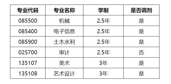 我校2021年碩士研究生專業(yè)均為全日制專業(yè)學(xué)位,各專業(yè)學(xué)制及調(diào)劑信息如下: