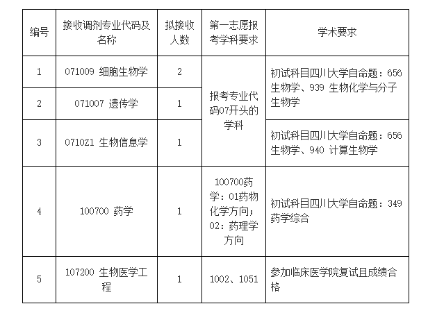 (1)調劑生的初試成績須同時達到第一志愿及調入志愿四川大學碩士研究生招生考試考生進入復試的初試成績基本要求;