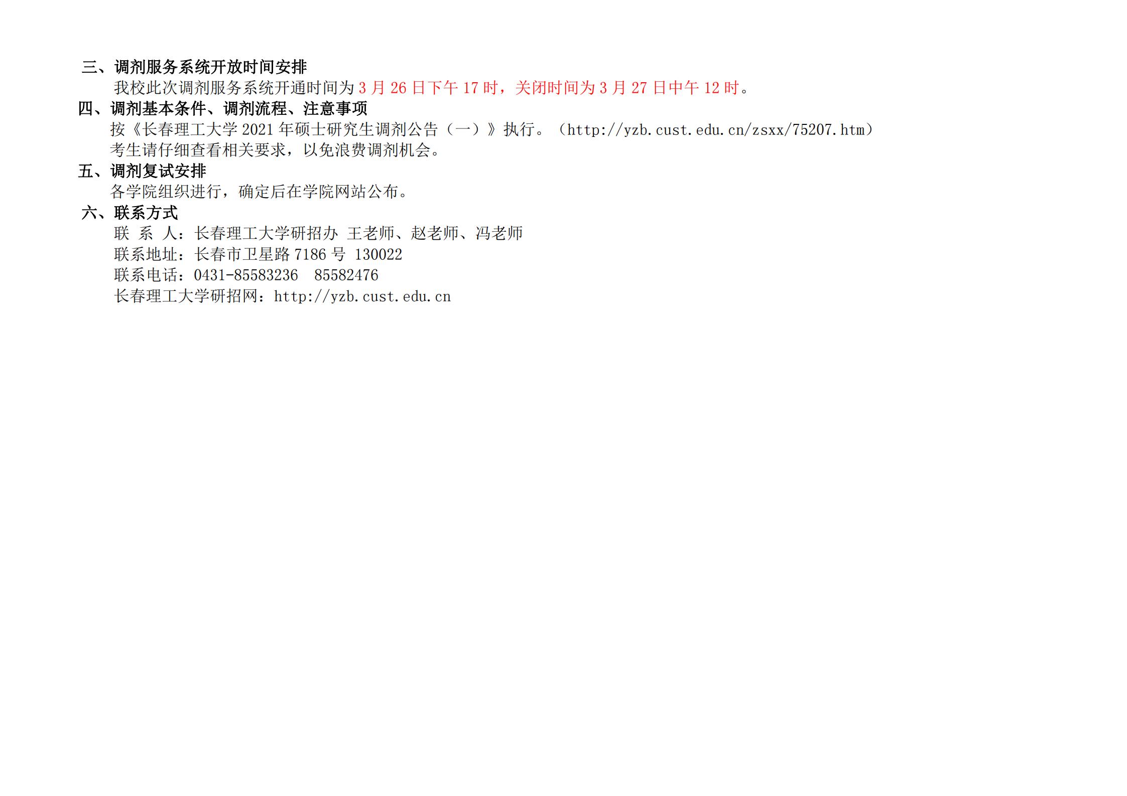 以上就是小編整理“2021考研調(diào)劑:長(zhǎng)春理工大學(xué)部分學(xué)院2021年碩士研究生調(diào)劑公告(二)”的全部?jī)?nèi)容,想了解更多調(diào)劑信息,請(qǐng)持續(xù)關(guān)注本網(wǎng)站。