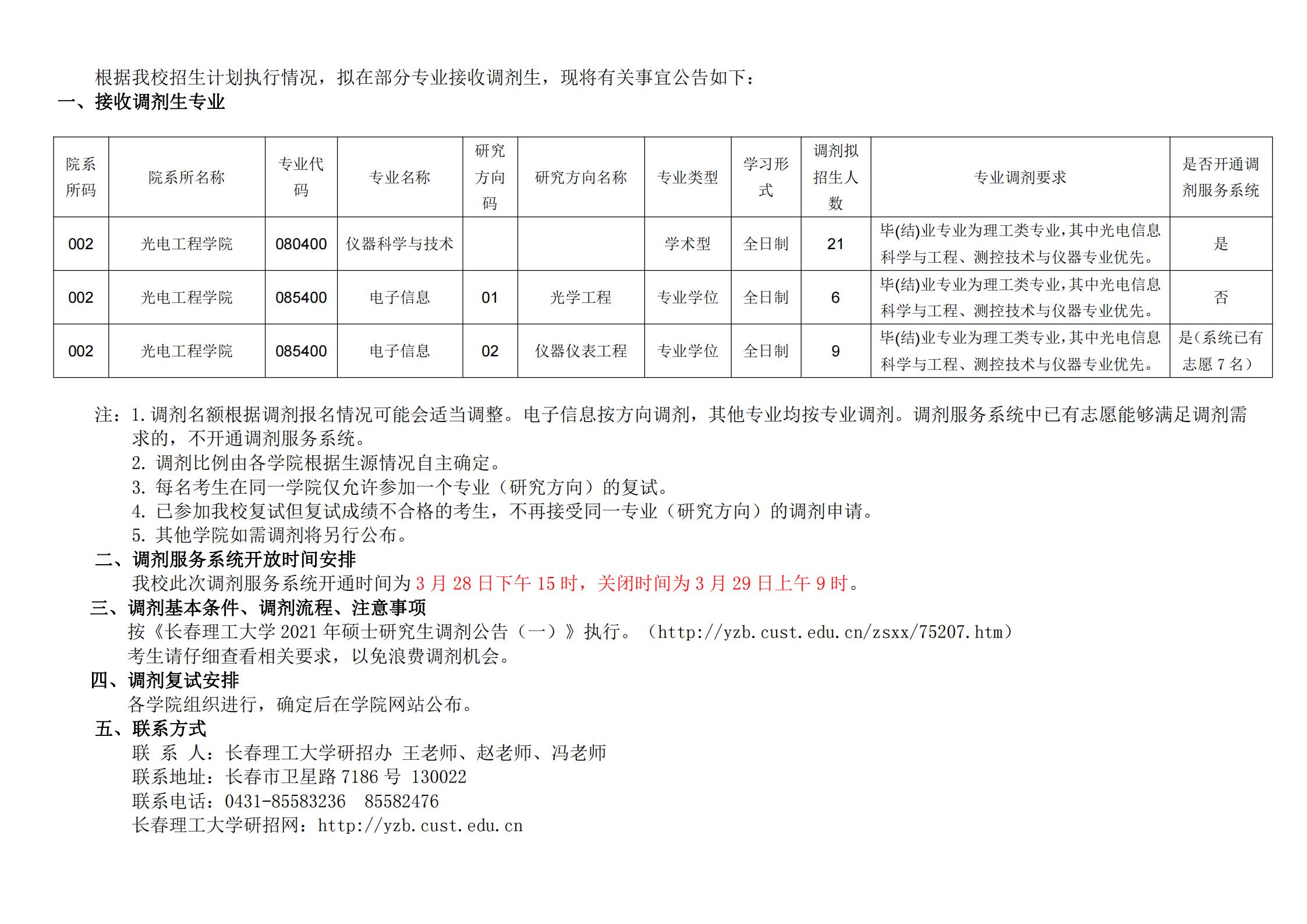 以上就是小編整理“2021考研調劑:長春理工大學光電工程學院2021年碩士研究生調劑公告(二)”的全部內容,想了解更多調劑信息,請持續關注本網站。