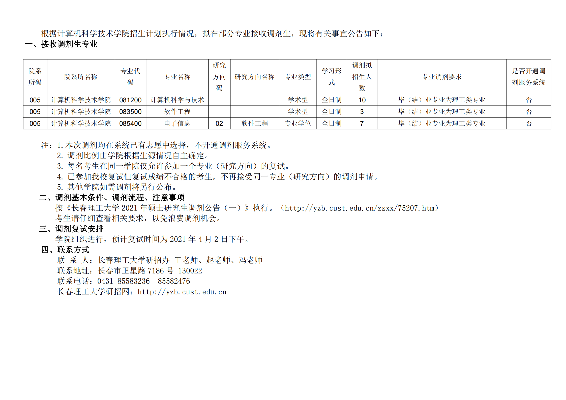 考研是場(chǎng)信息戰(zhàn),必須搶占先機(jī)!考研調(diào)劑更是如此。以下是“2021考研調(diào)劑:長(zhǎng)春理工大學(xué)計(jì)算機(jī)科學(xué)技術(shù)學(xué)院2021年碩士研究生第二批調(diào)劑公告”的全部?jī)?nèi)容。