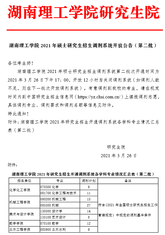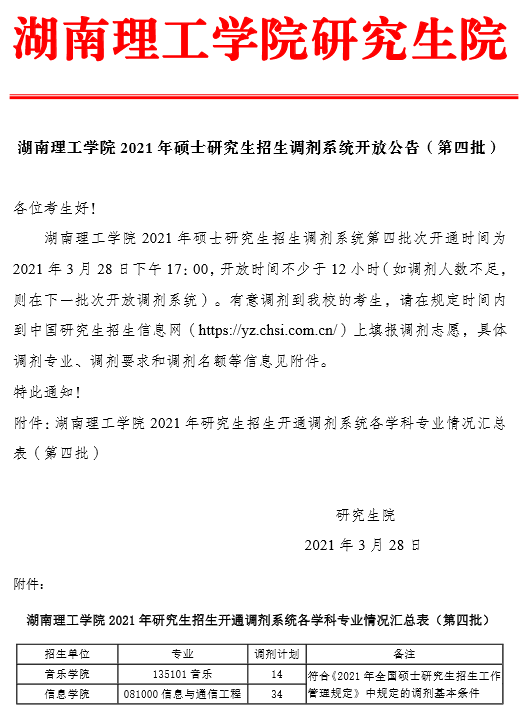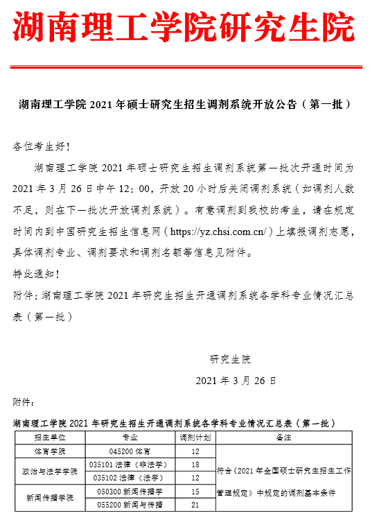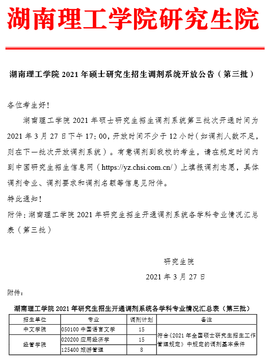 以上就是小編整理“2021考研調劑:湖南理工學院2021年碩士研究生招生調劑系統開放公告匯總”的全部內容,想了解更多調劑信息,請持續關注本網站。