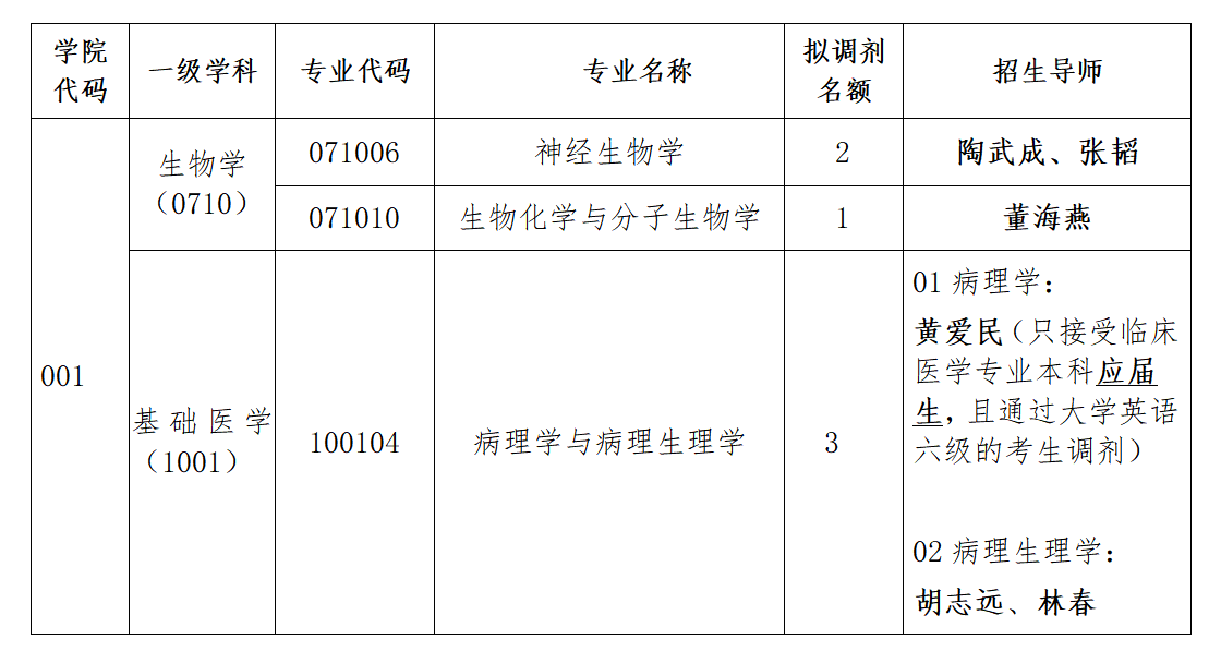 5.基礎(chǔ)醫(yī)學(xué)類(1001)專業(yè):100104病理學(xué)與病理生理學(xué)專業(yè)中研究方向01腫瘤病理學(xué),只接受臨床醫(yī)學(xué)專業(yè)本科應(yīng)屆生調(diào)劑。其他方向優(yōu)先接受初試志愿報考相同一級學(xué)科,即基礎(chǔ)醫(yī)學(xué)類專業(yè)(1001)的調(diào)劑,其次接受初試志愿報考相近學(xué)科專業(yè)的調(diào)劑,其中臨床醫(yī)學(xué)專業(yè)(1002、1051)優(yōu)先。