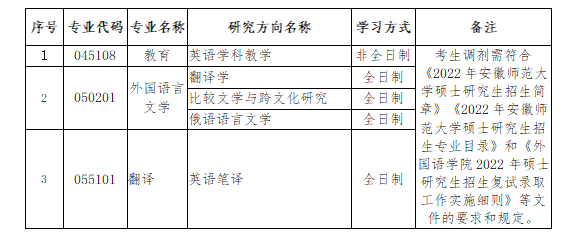 以上就是小編整理“2022考研調劑:安徽師范大學外國語學院2022年碩士研究生招生調劑安排”的全部內容,想了解更多調劑信息,請持續關注本網站。