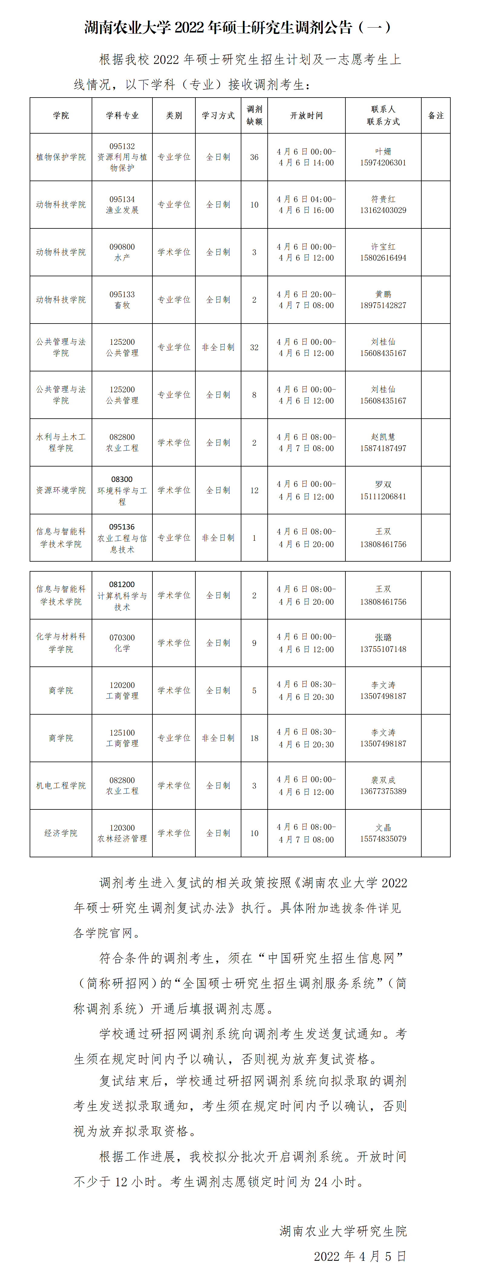 以上就是小編整理“2022考研調劑:湖南農業大學2022年碩士研究生調劑公告(一)”的全部內容,想了解更多調劑信息,請持續關注本網站。