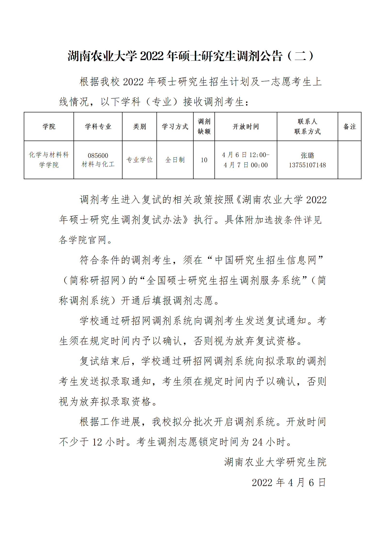以上就是小編整理“2022考研調劑:湖南農業大學2022年碩士研究生調劑公告(二)”的全部內容,想了解更多調劑信息,請持續關注本網站。